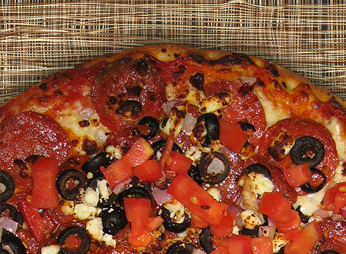 Pepperoni, black olives, onions,fresh tomatoes, oregano & feta cheese