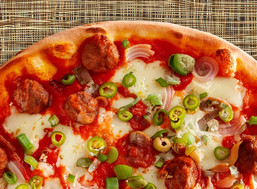 Marinara sauce, fresh meatballs, mozzarella cheese, Parmesan cheese, red and green onions, seasoned with garlic powder and Italian seasonings