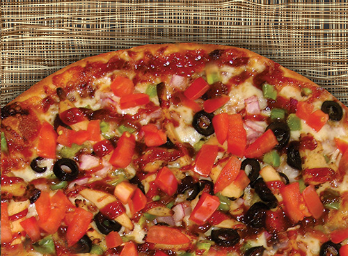 BBQ sauce, grilled chicken, red & green bell peppers, black olives, red onions & fresh tomatoes